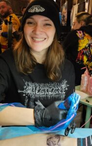 Rebecca has been a licensed tattoo artist since December 2021. She has a background in marketing and graphic design and worked as a marketing manager at a zoo for around ten years before expanding her horizons into a career tattooing.